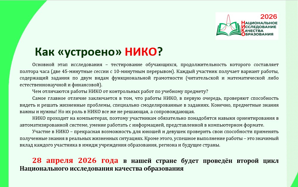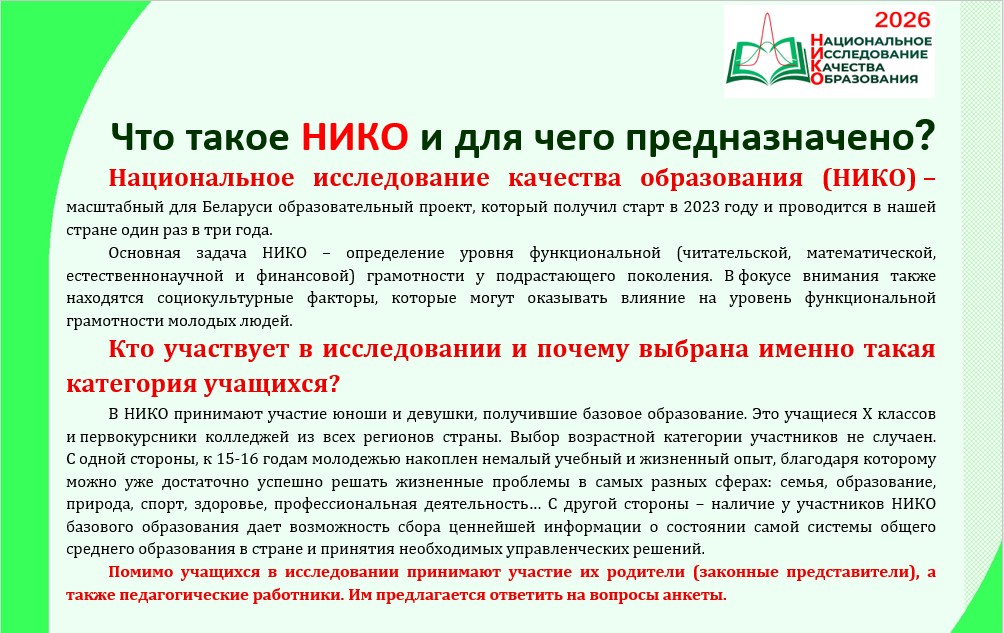 НИКОэто оценка функциональной грамотности обучающихся, определение того, насколько сегодняшние юноши и девушки готовы к взрослой жизни, решению реальных жизненных проблем с использованием тех знаний и умений, которые они получили в учреждениях образования.