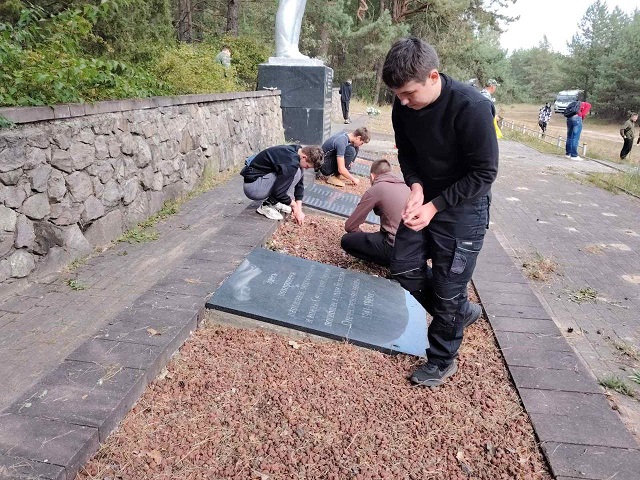 Ребята вместе с педагогами провели комплекс мероприятий по благоустройству территории: уборку основной зоны, очистку знаковых мест мемориала, осенний уход за клумбами.
